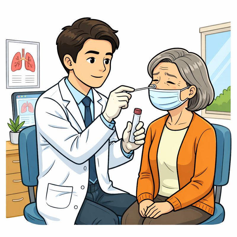 - 鼻の奥に細い綿棒を入れてぬぐい液を採取します(インフルエンザ検査と同様の手技です)